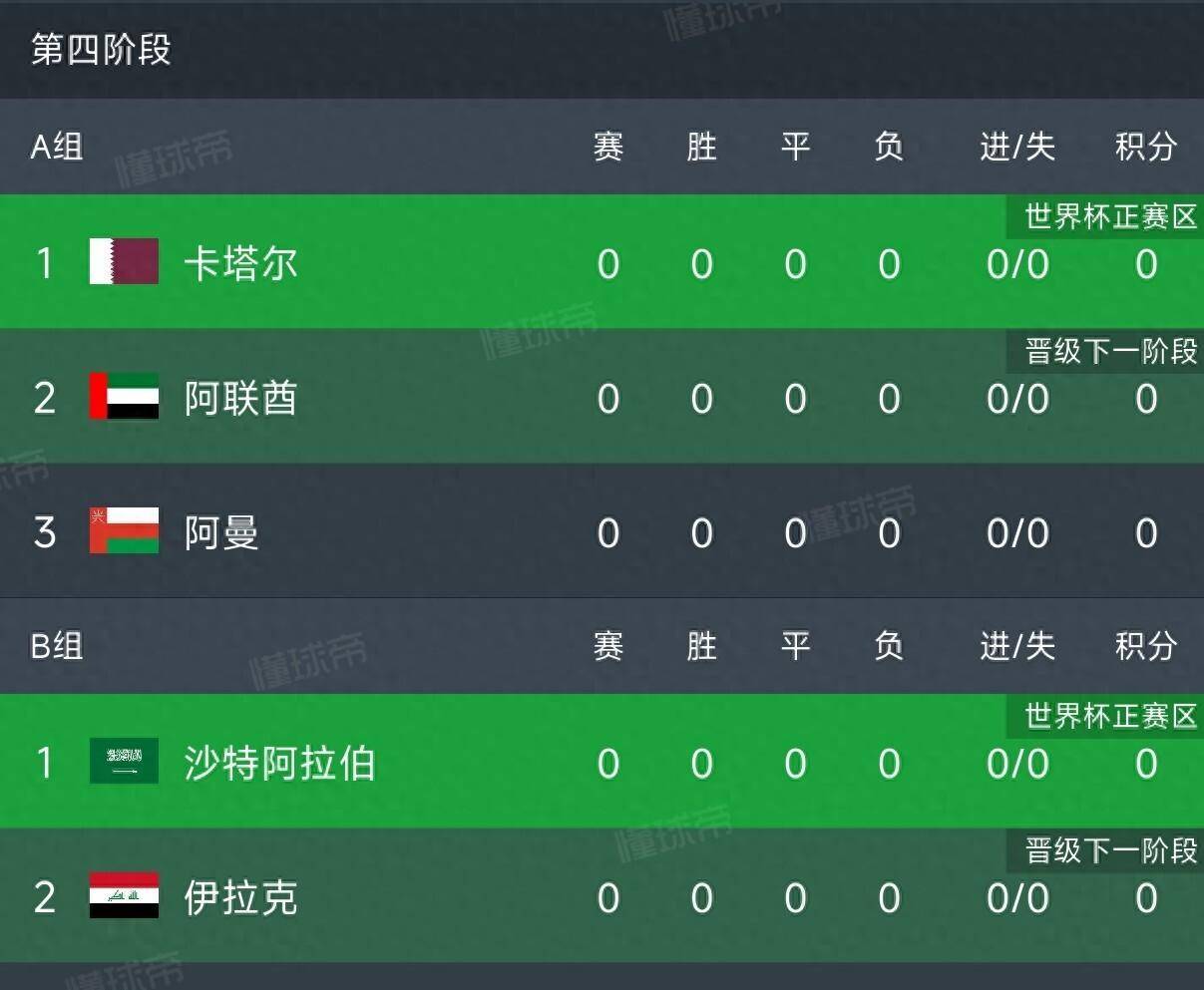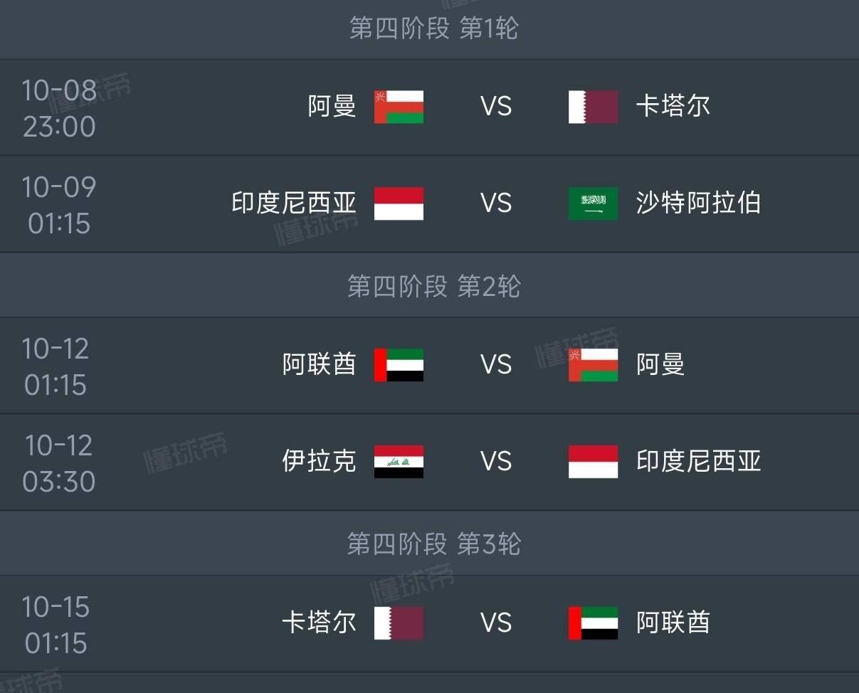 比赛日程已经确定:10月8日印尼对阵沙特、阿曼对阵卡塔尔;10月11日伊拉克对阵印尼、阿联酋对阵阿曼;10月14日卡塔尔迎战阿联酋、沙特面对伊拉克。