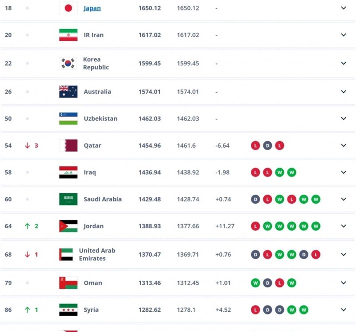 亚洲排名第五至第十三位的球队依次是:沙特阿拉伯(世界第35)、卡塔尔(世界第37)、乌兹别克斯坦(世界第41)、伊拉克(世界第55)、阿联酋(世界第58)、阿曼(世界第60)、约旦(世界第64)、巴林(世界第70)和叙利亚(世界第77)。 中国男足的世界排名为第93位,在亚洲位列第14,排在上述球队之后。 乌兹别克斯坦队在意大利籍教练卡纳瓦罗的带领下,历史性地首次打入世界杯决赛圈,他们将在2026年亮相北美赛场。